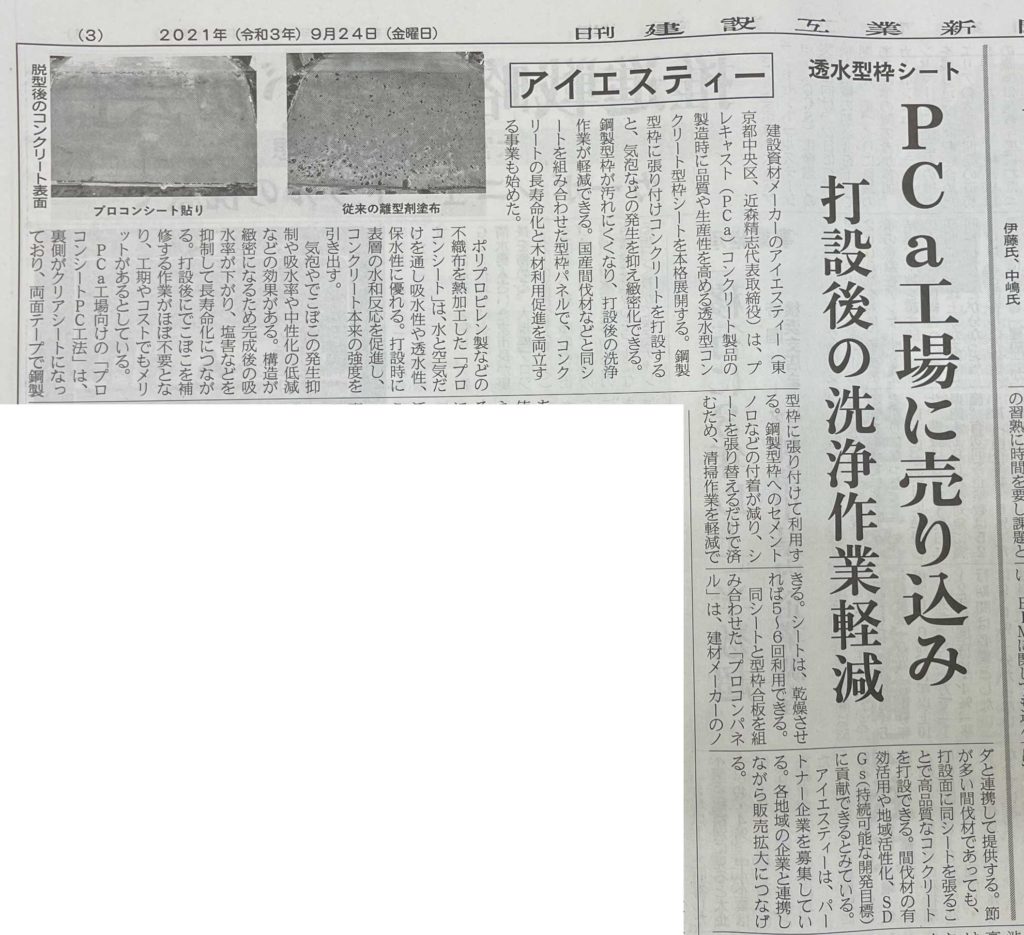 The Permeable Concrete Formwork Sheet “Proconsheet®” was published in the Nikkan Kensetsu Kogyo Shimbun!